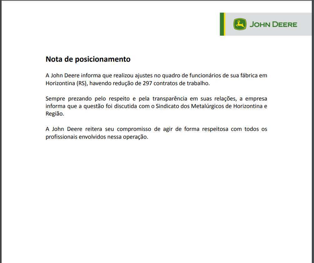 Após semanas de boatos foi confirmada nesta segunda-feira, nova onda de demissões na John Deere Brasil, Unidade Industrial de Horizontina.