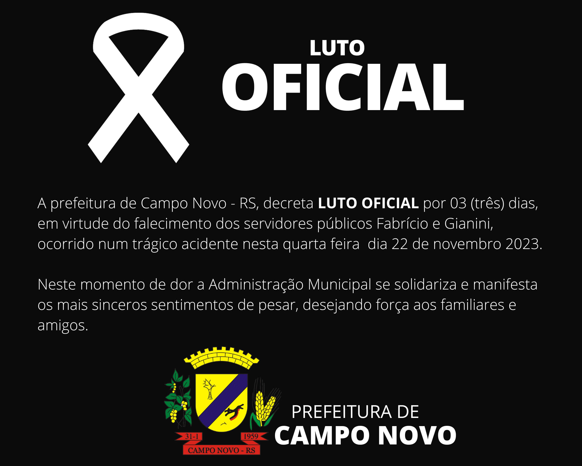 A Prefeitura Municipal de Campo Novo, publicou nota em rede social decretando luto oficial de três dias no município pela morte do casal de servidores municipais Fabrício e Gianini Schug, ocorridos no trágico acidente.