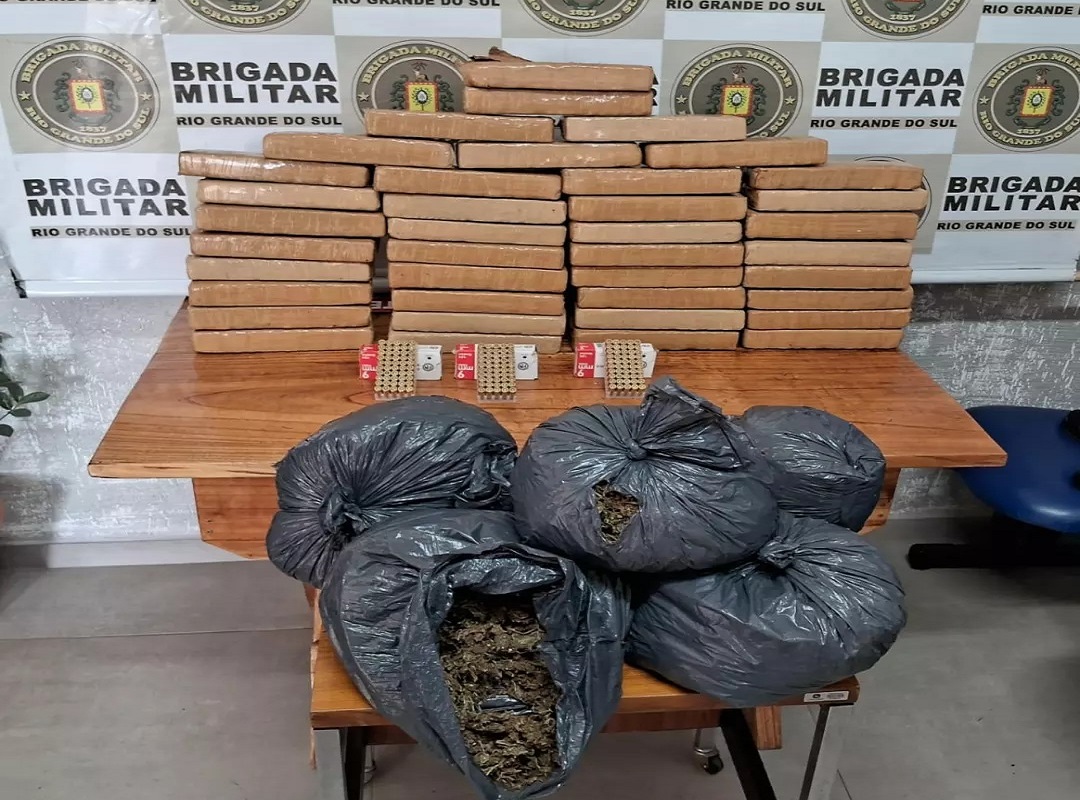 Com eles foram localizados 33,3kg de substância com características semelhantes à cannabis sativa, sendo 27,32Kg de maconha dividida em 40 tabletes e 6kg de maconha do tipo camarão.