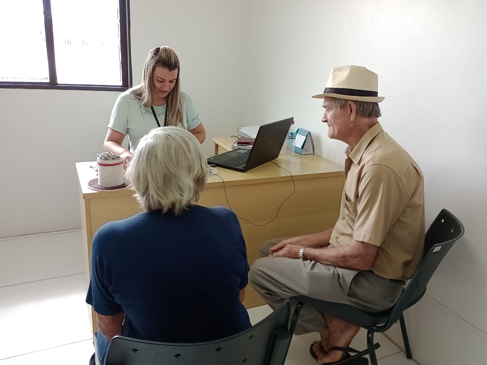 Pedro Ritter, de 73 anos, do município de Boa Vista do Buricá, esteve na Aapecan Santa Rosa, juntamente com sua esposa Maria Ritter, para realizar o cadastro. Na foto, a assistente social da Unidade, Anidrea Maslowski, realiza o acolhimento do casal.