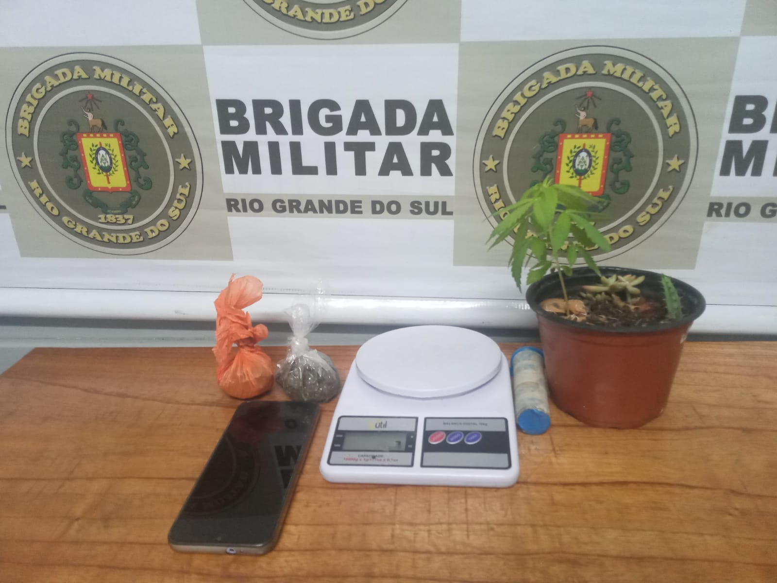 Materialidade delituosa: 1 PORÇÃO DE MACONHA (3,7 gramas), 1 PORÇÃO DE MACONHA (15,4 gramas), 1 PORÇÃO DE MACONHA (17,5 gramas), 1 VASO COM 1 PLANTA DE MACONHA (10cm altura), 1 BALANÇA (branca), 1 CELULAR (preto, Sansung), 1 CELULAR (roxo, Motorola), 1 CARTÃO.