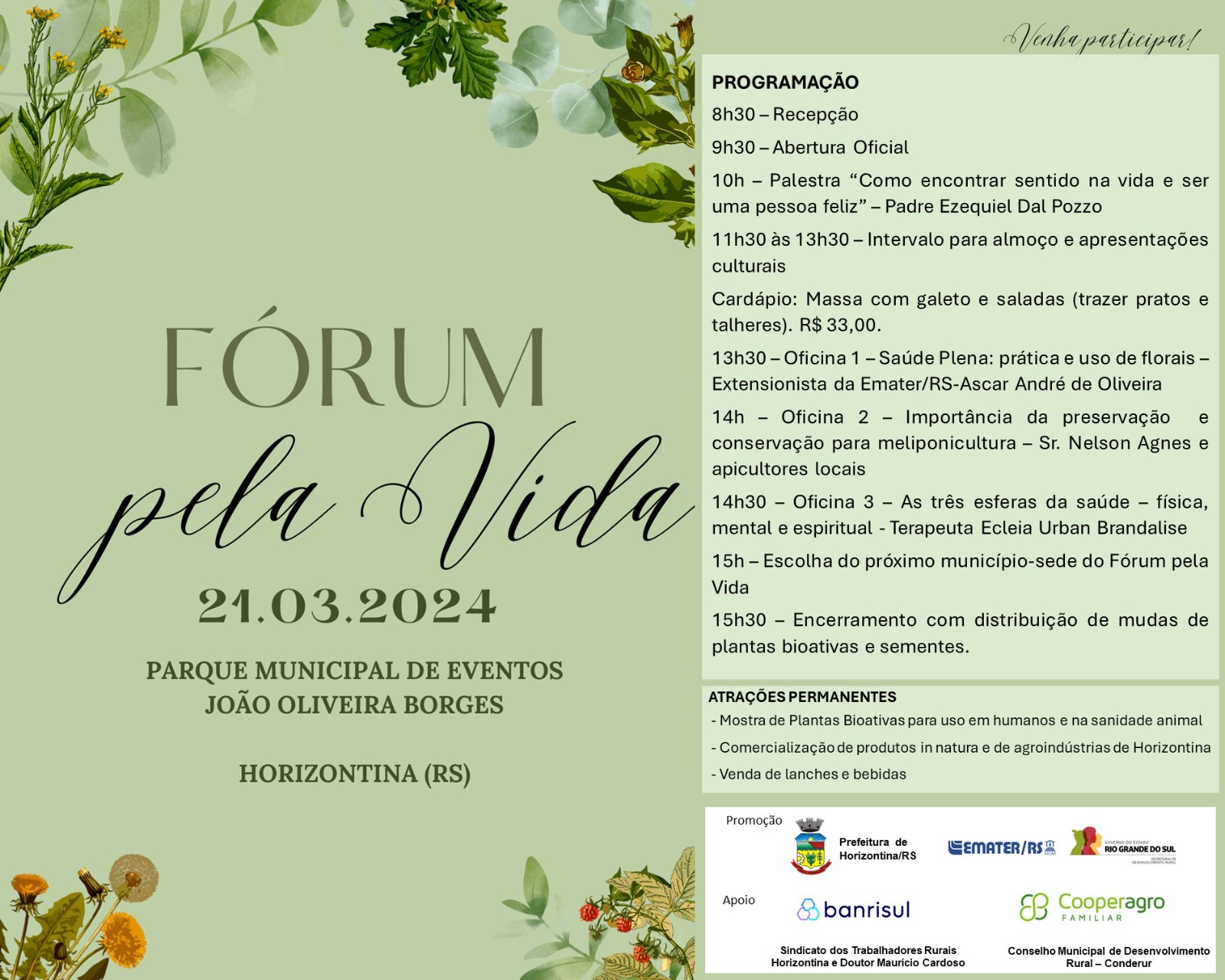 Sob a coordenação da EMATER RS/Ascar e Prefeitura Municipal de Horizontina, será realizada em Horizontina dia 21 de março de 2024, a 20ª edição do Fórum pela Vida. O evento ocorre anualmente e sempre muda de município sede, visando a melhor integração entre os atores e o público-alvo.