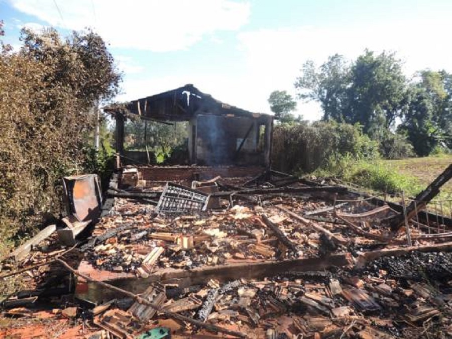 Uma casa desabitada foi totalmente destruída pelo fogo, em incêndio na madrugada deste domingo (28) na comunidade de Vila Pratos, interior do município de Nova Machado.