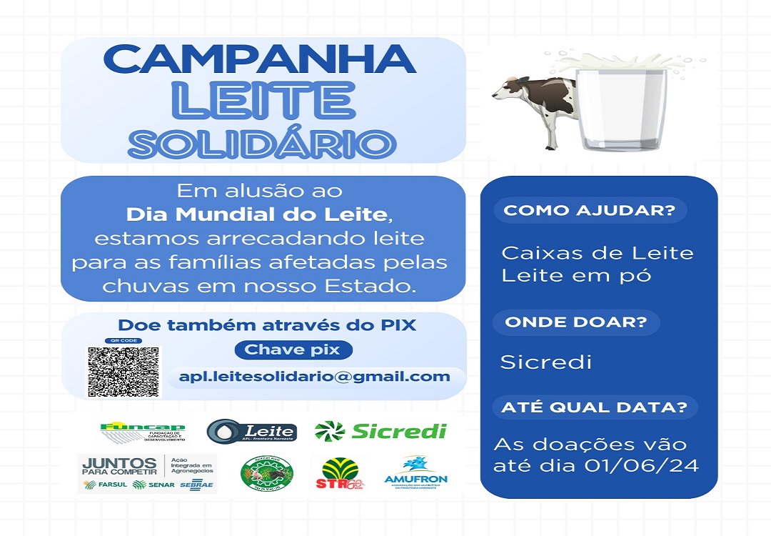 Com apoio da Funcap, APL Leite Fronteira Noroeste, Sicredi, Programa Juntos para Competir, Farsul, Senar, Sebrae, Sindicato Rural de Três de Maio, Sindicato dos Trabalhadores Rurais de Três de Maio e Associação dos Municípios da Fronteira Noroeste, as doações também podem ser realizadas através da chave pix [email protected]