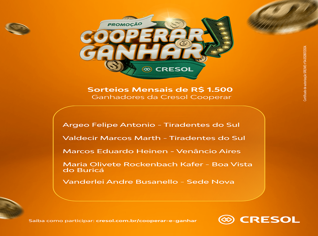 Para mais informações sobre a campanha e como participar, acesse o site da cooperativa e saiba os detalhes; www.cresol.com.br/campanha/cooperar-e-ganhar/ ou entre em contato com nossas agências.