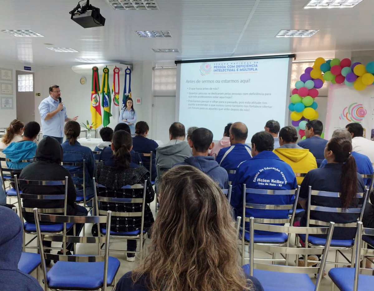 Iniciou na quarta-feira, dia 21, a programação da Semana Nacional da Pessoa com Deficiência Intelectual e Múltipla em todo o país. Na Apae de Três de Maio, a abertura das atividades ocorreu com uma palestra para os alunos e professores sobre o tema da campanha deste ano: ‘Nossa história: quem somos e o que fazemos’, ministrada pela psicóloga Carina Mayer Mirowski e pelo assistente social Leandro Steiger.