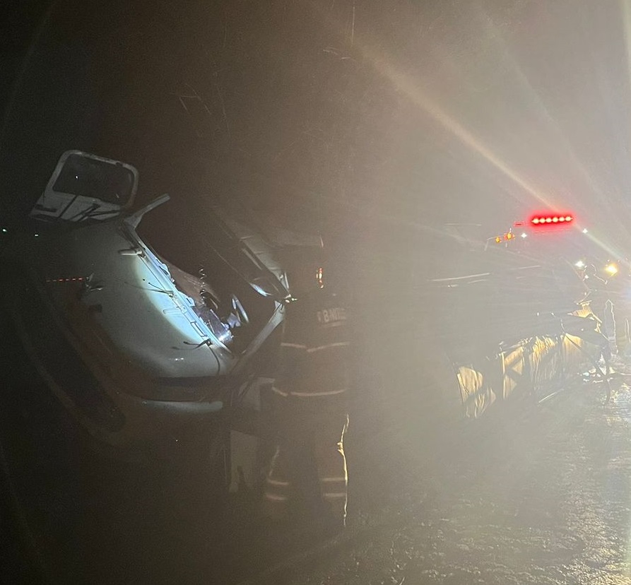 Veículos envolvidos um caminhão tanque que transportava leite, marca Mercedes Benz, e um veículo Volkswagen Gol, que colidiram lateralmente na rodovia.
