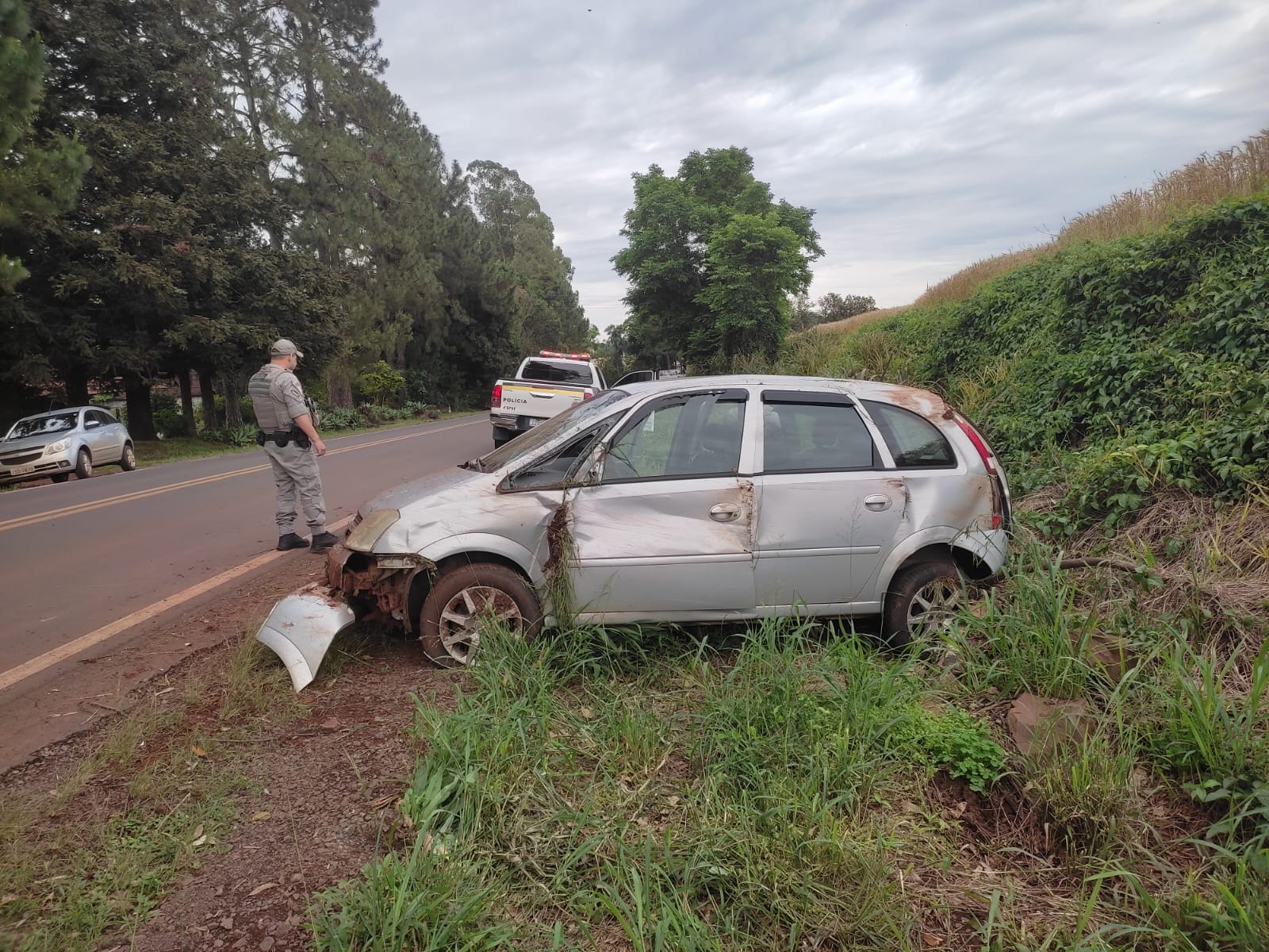 A Brigada Militar também esteve no local fazendo as orientações do trânsito. Não há informações de outros veículos envolvidos, e o carro ficou na lateral da rodovia para ser resgatado pelos proprietários. A Meriva trafegava no sentido Três de Maio – Horizontina.