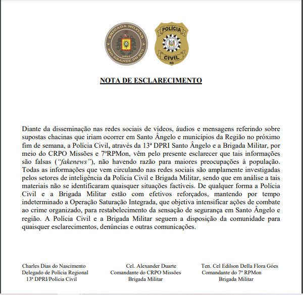 Nota oficial da Polícia das Missões. Forças de Segurança de Santa Rosa foram ao rádio para repassar o mesmo pedido.