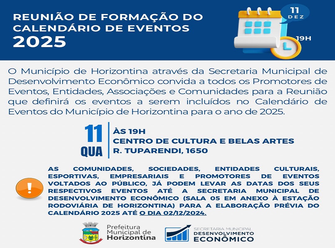 A Prefeitura Municipal de Horizontina, através da Secretaria Municipal de Desenvolvimento Econômico, reunirá os Promotores de Eventos, Entidades, Associações e Comunidades visando a Definição do Calendário de Eventos de Horizontina para 2025.