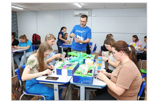 Thaís acrescenta que, no último módulo de formação, os professores criaram um robô artista, inclusive com o uso de materiais recicláveis. “Também conversaram em grupos sobre os aprendizados e fizeram uma avaliação do ArteLab e suas possibilidades, além de compartilhar o interesse dos alunos pelas ações já implementadas. Tivemos ainda uma Feira Maker, onde os educadores expuseram suas criações ao longo da capacitação. Foi muito gratificante perceber o engajamento de todos e o entusiasmo em aplicar as atividades com os estudantes”.