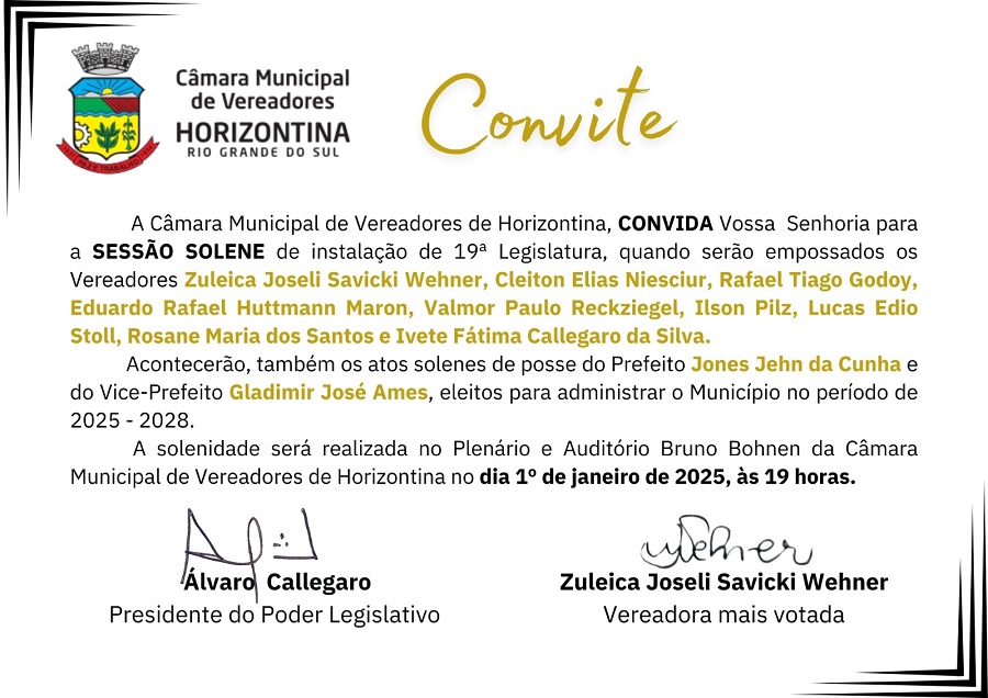 A Sessão Solene de posse dos novos vereadores, vice-prefeito e prefeito de Horizontina será às 19h do dia 1º de janeiro, na sede do parlamento municipal – Plenário e Auditório Bruno Bohnen.