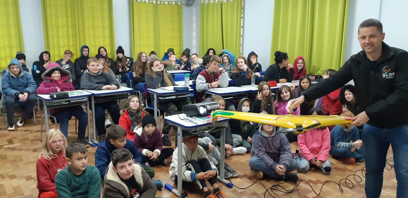 Em uma palestra organizada pela Escola Carlos Gomes, realizada em suas dependências para alunos do 4° ao 9° ano; o Diretor e Responsável Técnico da empresa GEOE, Vadenilson Patussi, apresentou os materiais gerados a partir dos levantamentos de campo do ano passado, entre eles as fotos registradas em voo e mapas elaborados, bem como levou para sala de aula os “Drones” da empresa. Foi explicado como foram processados os dados após o voo e como os mapas foram elaborados. Em meio à apresentação, criaram-se inter-relações deste trabalho com conteúdos que os alunos estão vivenciando na escola, e esses alunos tiveram a oportunidade também de fazer diversas perguntas sobre equipamentos e tecnologias envolvidas.