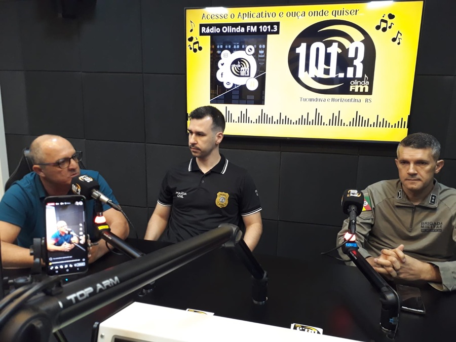 O Tenente RR da Brigada Militar, atualmente Diretor de Segurança Pública Municipal Elton Brüning, o Delegado de Polícia Marcelo Gasparetto e o Tenente da Brigada Militar Cássio Horazy, foram entrevistados nesta terça-feira, dia 6, na Rádio Olinda FM e plataformas FC e valorizaram os investimentos do Município de Horizontina na ampliação do sistema de Vídeo Monitoramento urbano, implantação do Cercamento Eletrônico, bem como o sistema de monitoramento por imagens na Segurança das Escolas, além de aquisição de um drone para os trabalhos de investigação das forças de segurança.