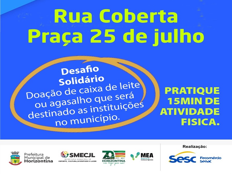 A Secretaria de Esportes, Cultura, Lazer e Juventude coordenará uma programação especial no próximo dia 28/05 (quarta-feira), na Rua Coberta, a partir das 8h. Trata-se da programação alusiva ao Dia do Desafio 2025, parceria com o SESC.