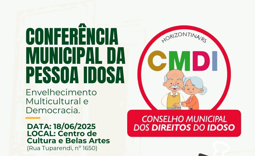 Sob a Coordenação do Conselho Municipal da Pessoa Idosa e Secretaria de Desenvolvimento Social – Governo Municipal, Horizontina realiza nesta quarta-feira, dia 18 de junho a Conferência do Idoso, um momento importante de diálogo, reflexão e construção de propostas em prol dos direitos e da qualidade de vida da pessoa idosa.