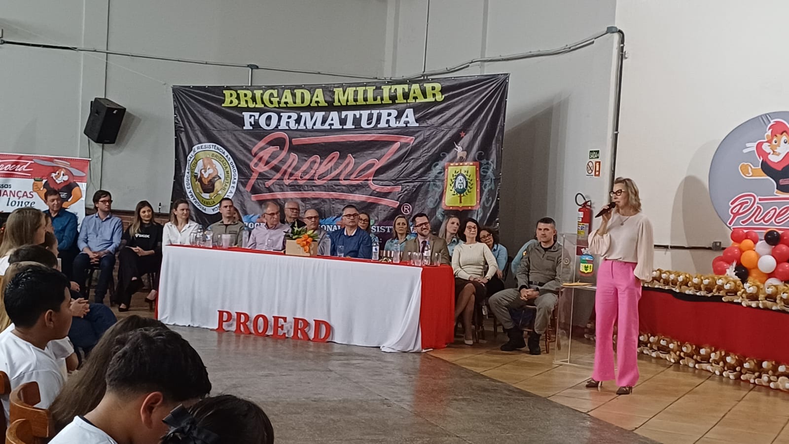 A formatura foi marcada por momentos de alegria e emoção, tornando-se uma noite inesquecível para alunos, familiares e toda a comunidade escolar. Um dos momentos mais emocionantes foi a apresentação de uma aluna formanda, Valentina Marmitt Zdruikoski, cantora mirim, que já faz parte de um grupo musical. Ela encantou a todos ao cantar a música oficial do PROERD, acompanhada pelas turmas.