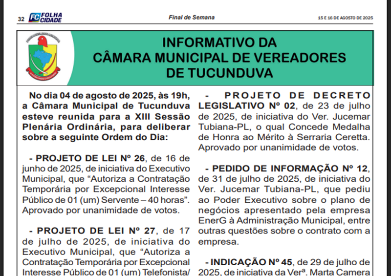 Sessão Plenária Ordinária 1 de Agosto 2025. Indicações/Providências/Informações