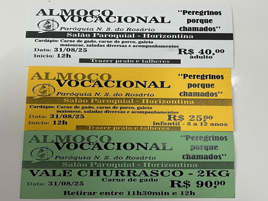 A Paróquia Nossa Senhora do Rosário de Horizontina convida a comunidade para mais uma edição do Almoço Vocacional, que ocorrerá no dia 31 de agosto. Este evento é uma oportunidade para encontro, oração e partilha, relembrando a todos que somos peregrinos, chamados a seguir Jesus em nossa missão, destaca o convite do evento.
