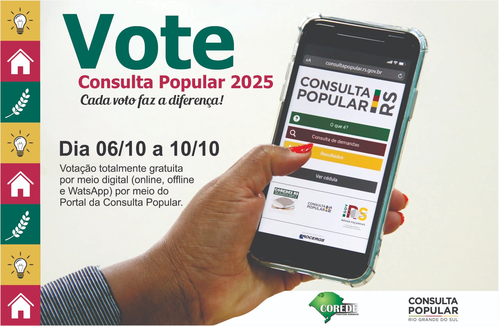 O Conselho de Desenvolvimento da Fronteira Noroeste Corede/FN convida toda a população da Fronteira Noroeste para participar da votação da Consulta Popular, que será realizada entre os dias 06 e 10 de outubro de 2025.