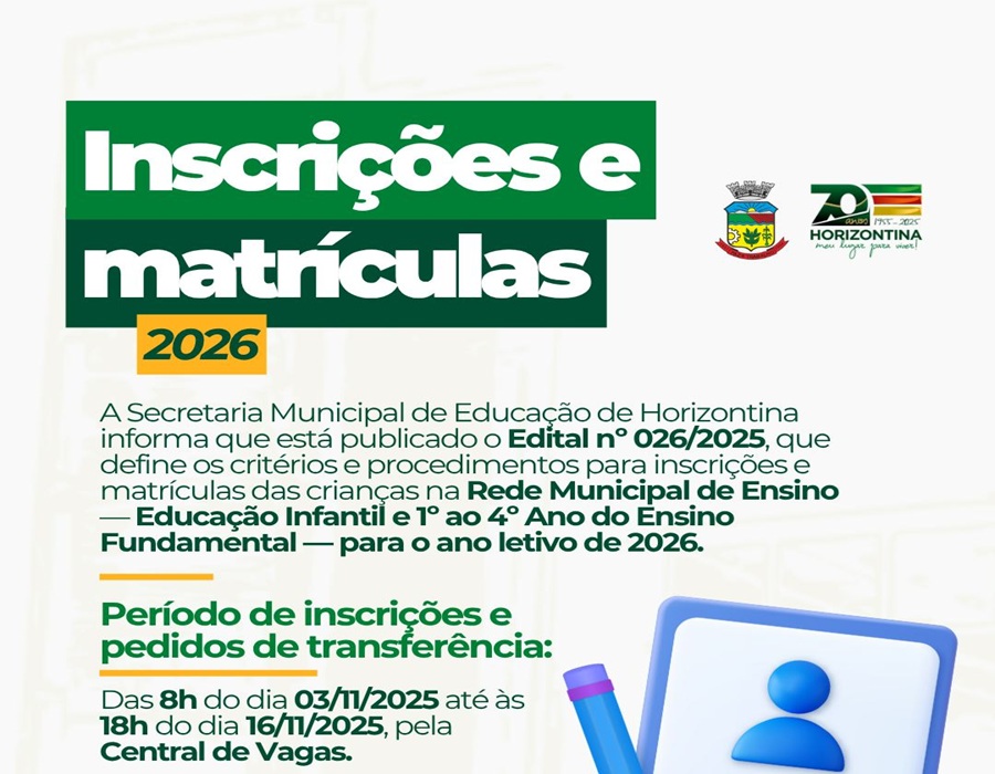 A Secretaria Municipal de Educação (SME) de Horizontina anuncia a publicação do Edital nº 026/2025, que estabelece as diretrizes e os passos para as inscrições e matrículas de crianças na Rede Municipal de Ensino para o ano letivo de 2026. Abrangendo tanto a Educação Infantil quanto o Ensino Fundamental (do 1º ao 4º ano), este edital é crucial para pais e responsáveis que desejam garantir uma vaga para seus filhos nas escolas municipais.