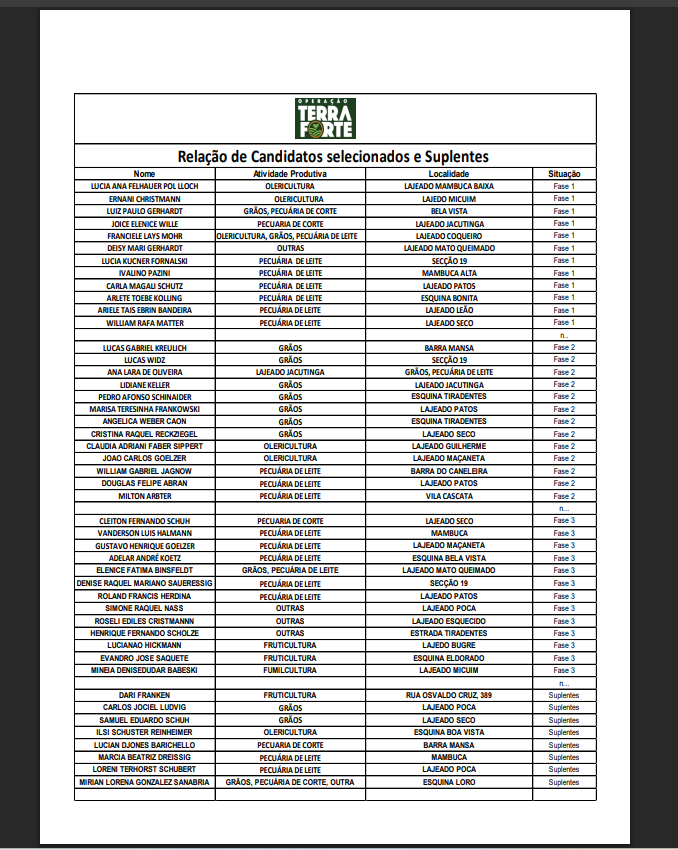 Em Horizontina o Comitê Municipal de Avaliação destaca a lista dos aprovados. Há prazo de contestação. Para isso buscar informações junto aos integrantes do Conselho de Desenvolvimento Agropecuário, Secretaria de Desenvolvimento Rural ou junto ao STR.