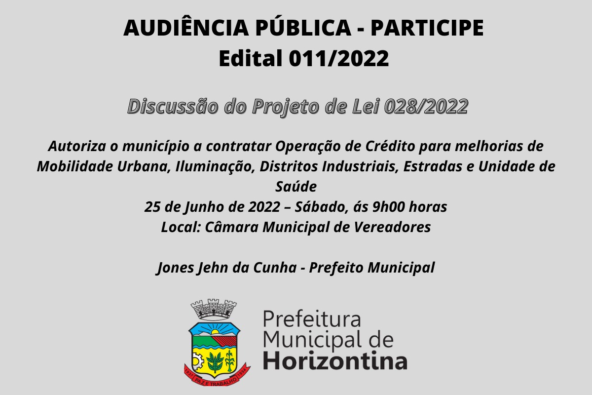 O Governo Municipal de Horizontina está convocando para este sábado, dia 25 de junho, ás 9h da manhã, junto a sede da Câmara Municipal de Vereadores, uma importante Audiência Pública, para Discussão do Projeto de Lei 028/2022.