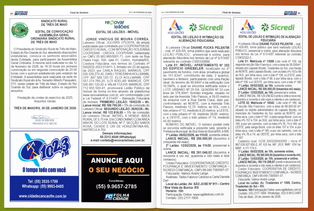 EDITAIS: AGO Sindicato Rural Três de Maio. Leilões em Horizontina, Tiradentes do Sul e Boa Vista do Buricá.