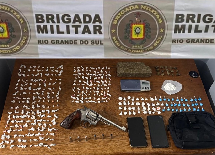 Durante a abordagem, os policiais localizaram e apreenderam um revólver calibre .38, seis munições do mesmo calibre, além de uma significativa quantidade de drogas já fracionadas para comercialização. Ao todo, foram apreendidas 289 porções de crack, 16 tabletes de maconha e 67 porções de cocaína. Também foram recolhidos dois aparelhos celulares e uma balança de precisão, itens comumente utilizados na atividade de tráfico.