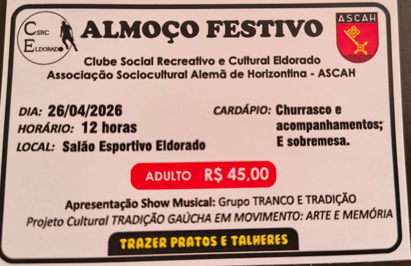 O evento acontece a partir das 12h, no Salão Ginásio Eldorado, reunindo associados, famílias e a comunidade em geral em um ambiente de confraternização e valorização cultural. No cardápio, será servido churrasco completo, com diversos acompanhamentos e sobremesa.