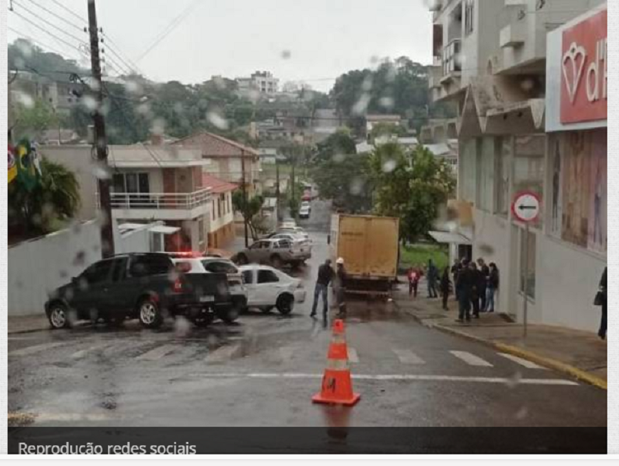 Um caminhão de uma distribuidora, que foi estacionado na rua São Bernardo, ao lado do Banco do Brasil, disparou sem motorista, atingindo pelo menos três veículos que estavam estacionados na lateral da rua.