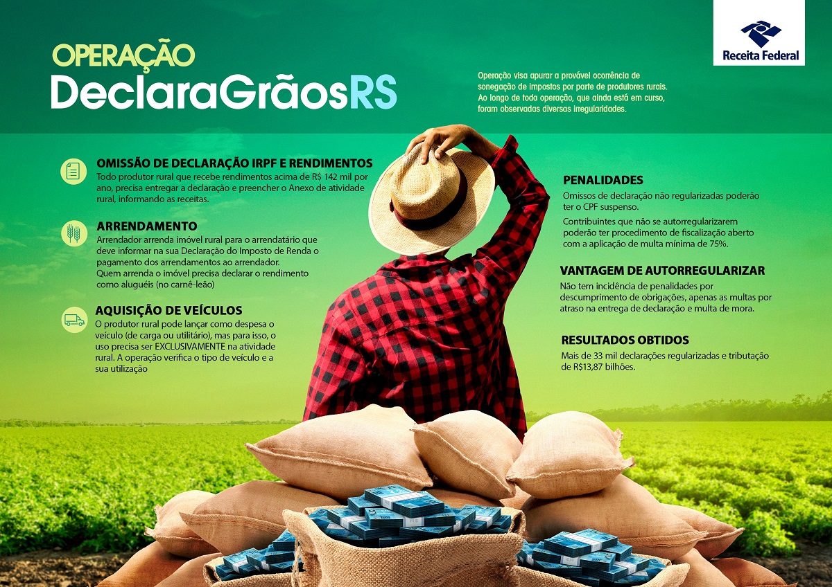 A Operação DeclaraGrãos RS, criada em 2019, visa promover a conformidade tributária de produtores rurais com irregularidades no Imposto de Renda Pessoa Física (IRPF), incentivando e facilitando o cumprimento de obrigações tributárias, principais ou acessórias, por meio da autorregularização.
