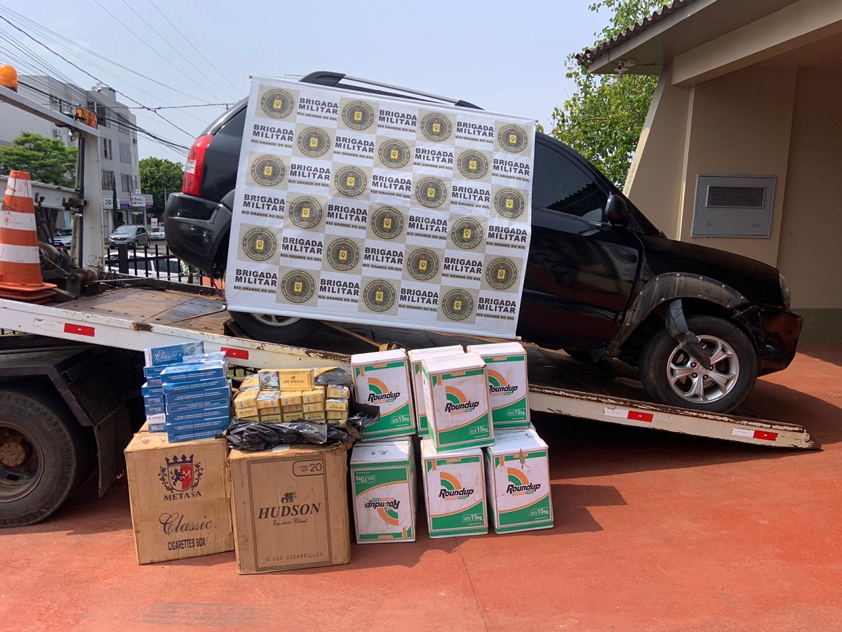 Uma camioneta Hyundai Tucson, de cor preta, trafegava carregada com 10 caixas de 15kg cada contendo herbicida marca Roundup Control Max industrializado na Argentina; 250 pacotes de cigarros da marca Hudson indústria paraguaia e 150 pacotes de cigarros marca Classic Box também indústria paraguaia.