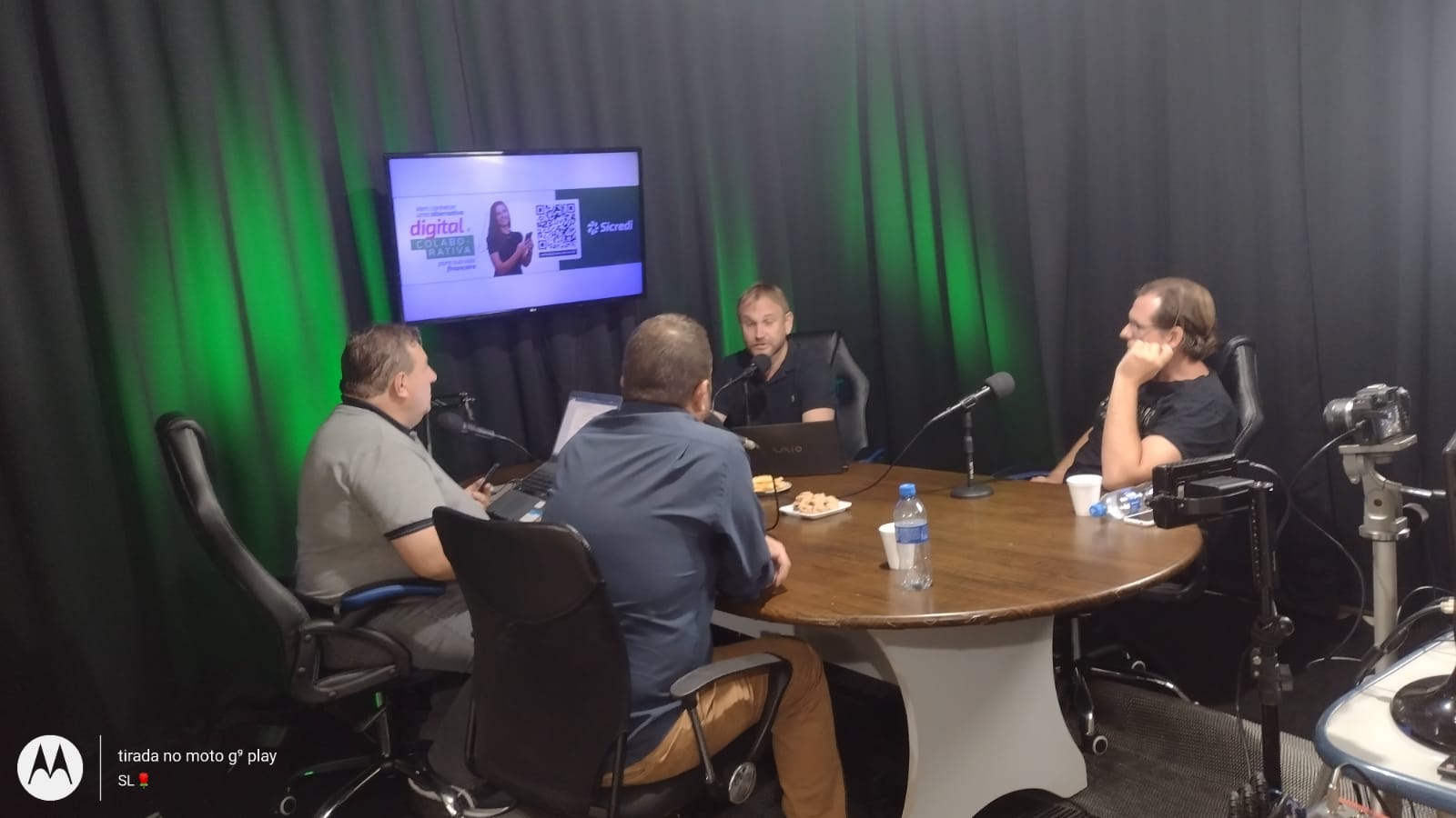 O apresentador Paulo Roberto, reuniu os professores do Curso de Economia e MBA da Fahor – Faculdade Horizontina, Márcio Eloir Schweig, Marcio Leandro Kalkmann e Stephan Sawitski.