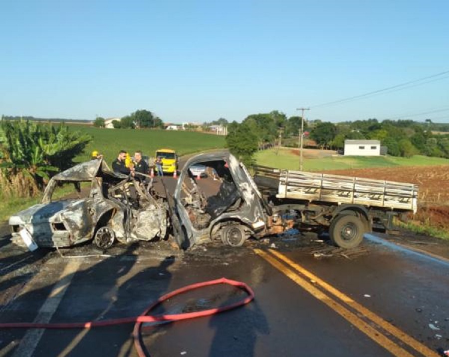 No local foi constatado um acidente de trânsito do tipo colisão frontal com incêndio, envolvendo um automóvel e uma caminhonete, com três óbitos no local (vítimas carbonizadas).