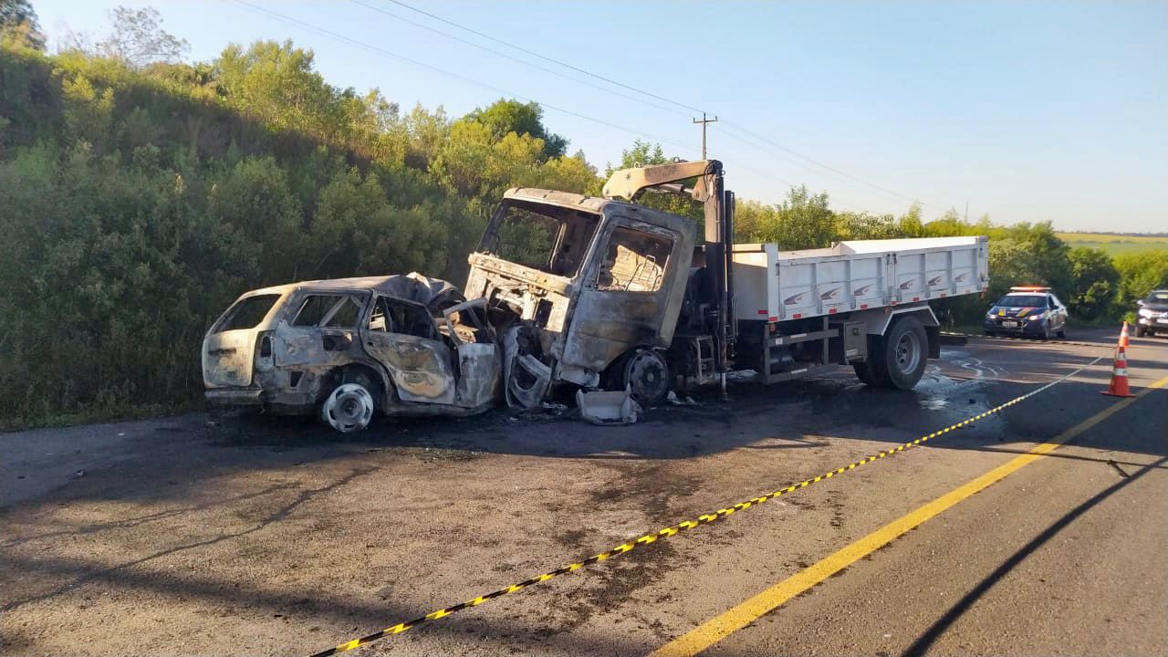 Por volta das 06h desta sexta-feira (10), no km 214 da BR 158, em Cruz Alta, a Polícia Rodoviária Federal atendeu um acidente do tipo colisão frontal envolvendo um automóvel Parati, com placas de Cruz Alta, e mais 3 caminhões, sendo 2 combinações Bitrem e 1 caçamba, todos com placas do RS.