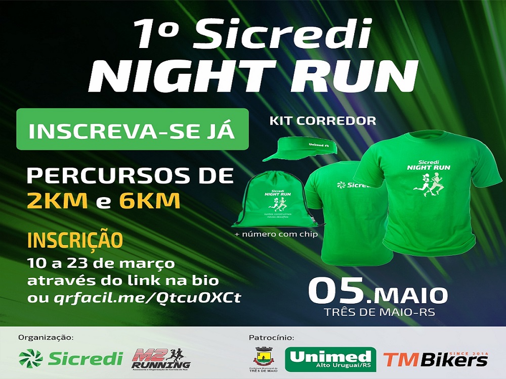 As inscrições para a 1ª Sicredi Night Run iniciaram no dia 10 de março e podem ser realizadas através do site www.qrfacil.me/QtcuOXCt