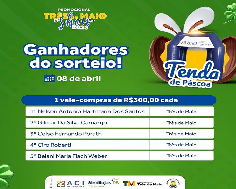 Os primeiros contemplados na fase de sorteios de Páscoa são: Nélson Antônio Hartmann dos Santos; Gilmar da Silva Camargo; Celso Fernando Porath; Ciro Roberti e Belani Maria Weber.