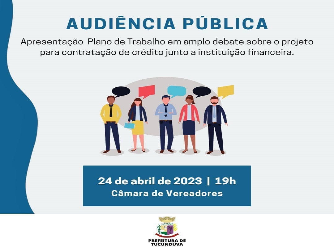 A Audiência Pública tratará de assuntos relacionados à ‘Apresentação do Plano de Trabalho e amplo debate sobre o Projeto para contratação de crédito junto a instituição financeira’, bem como, a apresentação do Projeto de Lei que visa contratação de crédito com plano de trabalho e no que serão aportados os recursos do financiamento.