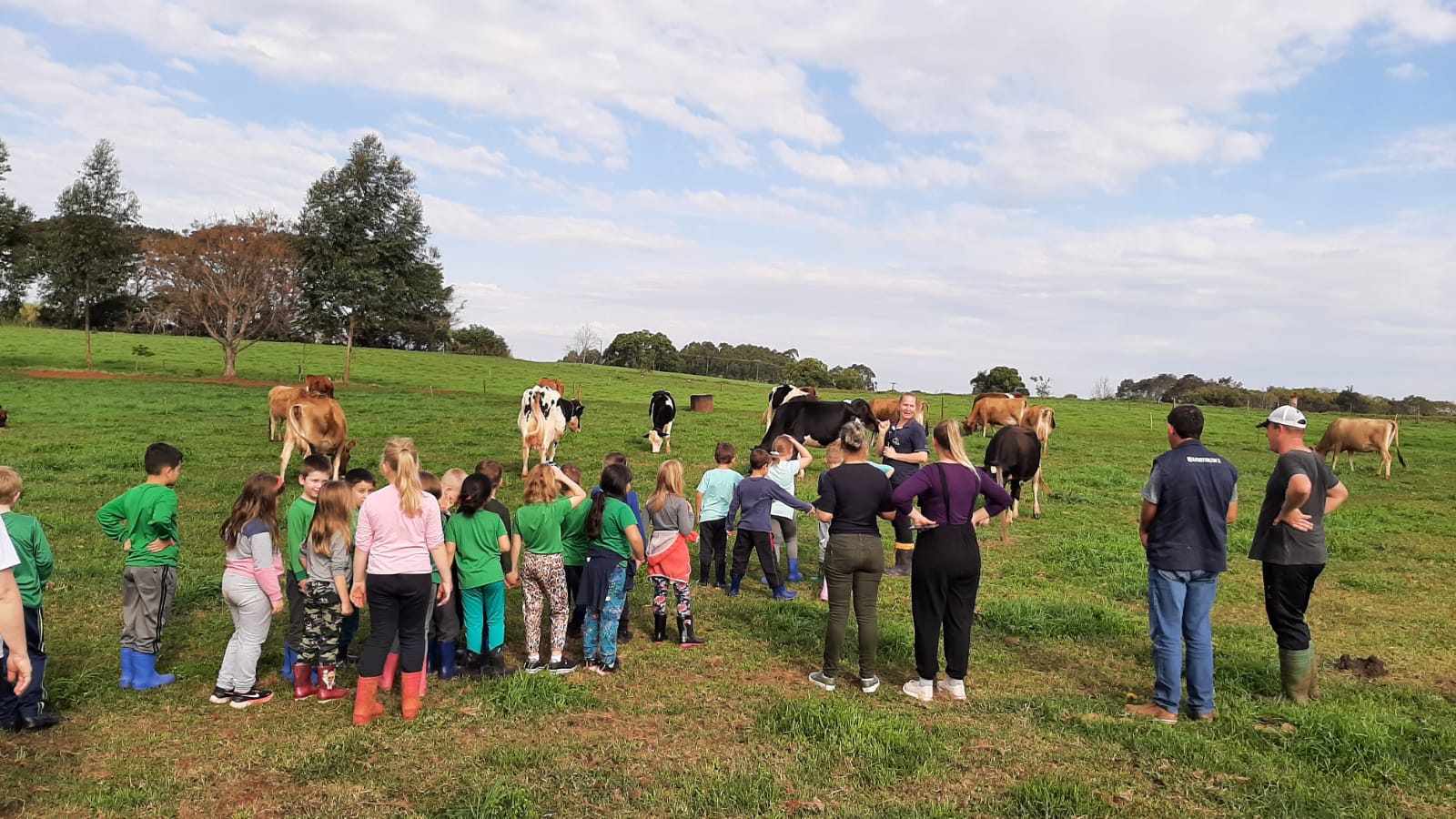 As crianças de seis e sete anos foram recebidas na propriedade de Leandro e Josiane Schroer, na localidade de Esquina Wünsch, onde conheceram o processo de produção de leite, desde o manejo dos animais até a ordenha.