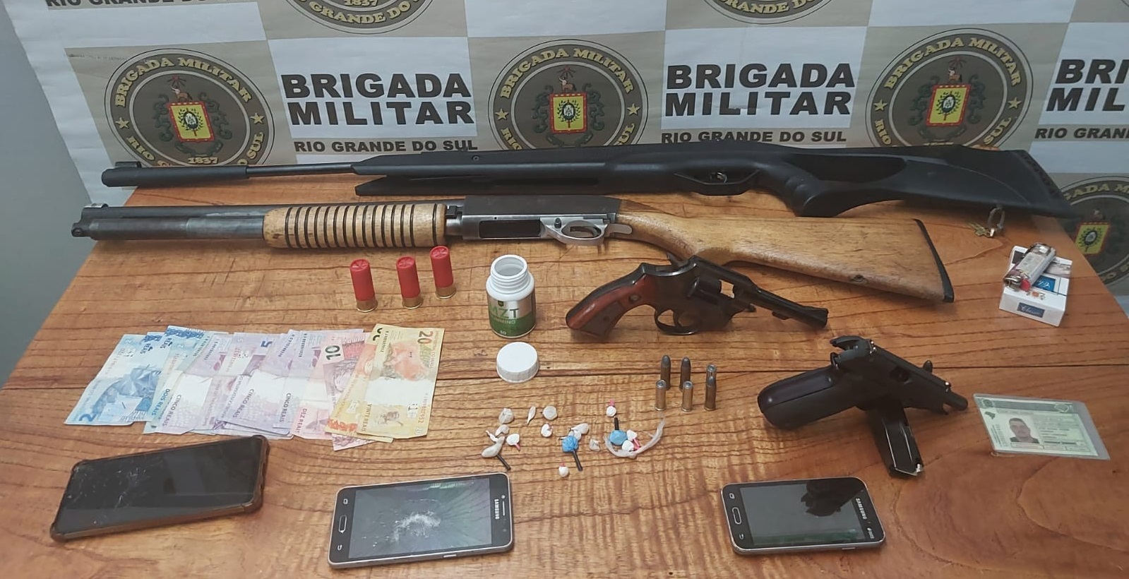 Foram encontrados com três homens, 9 porções de substância análoga a cocaína, 10 porções de substância análoga a crack, uma espingarda High Standard calibre 12, um revólver Taurus calibre 38, uma pistola Bersa calibre .380, uma carabina de pressão, munições de diversos calibres, R$109,00 em notas diversas e 3 aparelhos celulares.